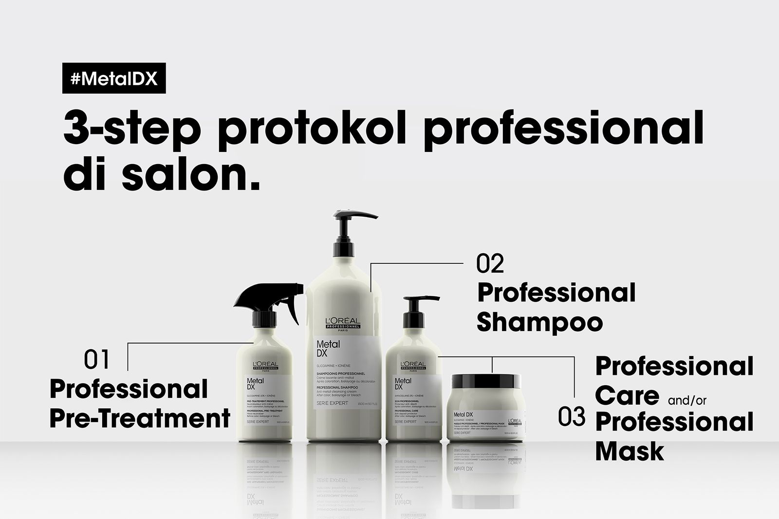 Rangkaian produk terbaru ini berfungsi untuk mendapatkan hasil pewarnaan rambut, balayage, dan lightening yang sesuai ekspektasi dengan menetralisir kandungan metal dalam serat rambut serta mencegah rambut patah hingga 87%. Inilah rangkaian tatacara mewarnai rambut dengan Metal DX.