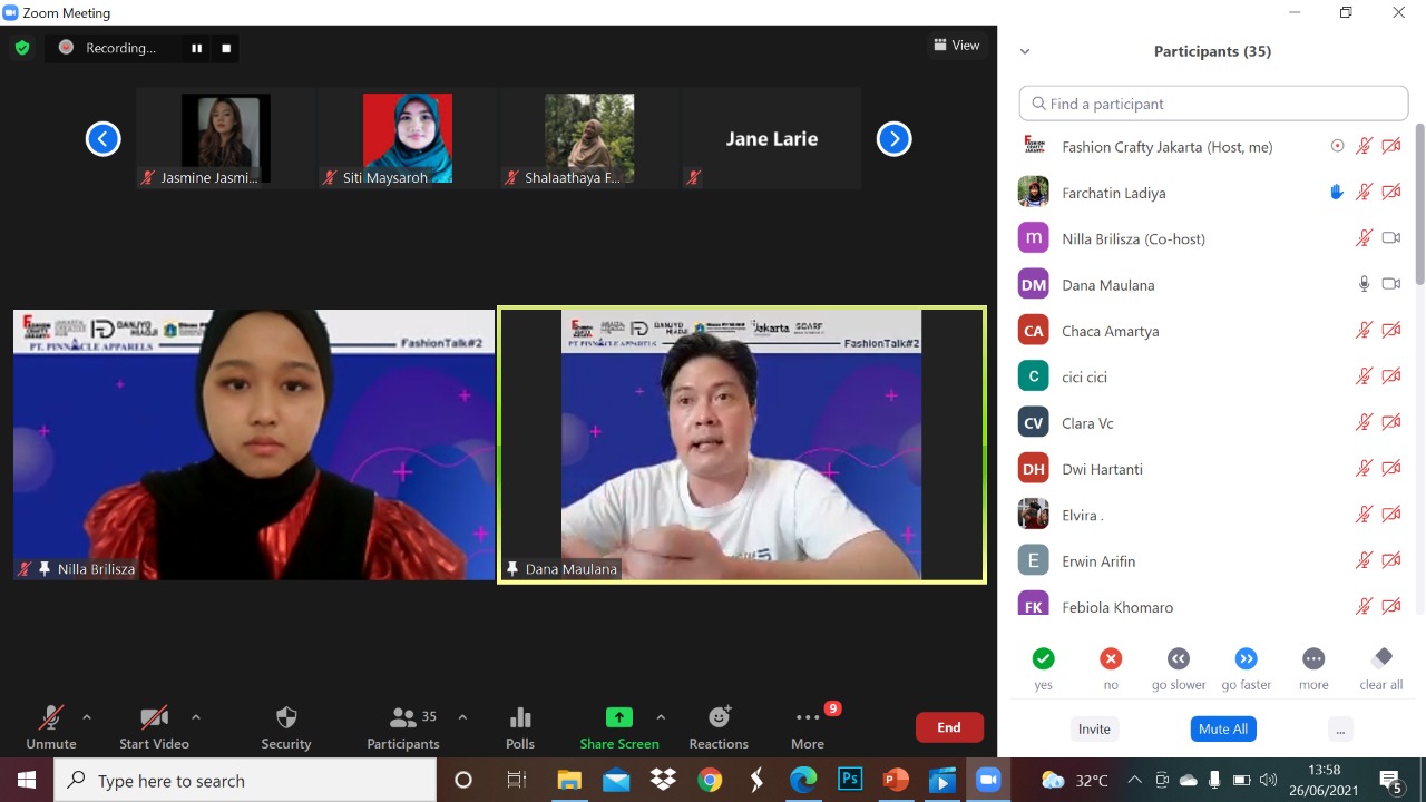 Pada hari Sabtu, 26 Juli 2021 Fashion Crafty Jakarta mengadakan Workshop Special dengan mengundang yaitu Dana Maulana (@danamaulanas) selaku Business Director dari Brand Danjyo Hiyoji (@danjyohiyoji), Wulan S. Haryono (@wulansharyono) selaku Founder dari Fashion Division (@fashiondivision.asia.europe) dan Meilinda Silalahi selaku Merchandiser Manager PT. Pinnacle Apparels sebagai pembicara dan akan berbagi pengalaman kesuksesan dan tips dan trik dari bisnis brand masing-masing narasumber.
