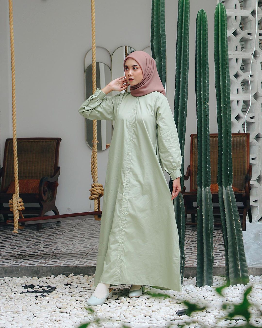 2. Kali ini ada koleksi dari Luma Dawa, yaitu Laiqa Abaya yang bisa Anda jadikan inspirasi. Abaya berwarna hijau sage dengan aksen kancing di bagian depan. Kemudian untuk pemilihan hijab segi empat dengan warna dove atau medium sea green. Untuk melihat koleksi lain dari Luma Dawa, Anda dapat mengunjungi laman https://lumadawa.co.id atau Instagram @lumadawa.official.