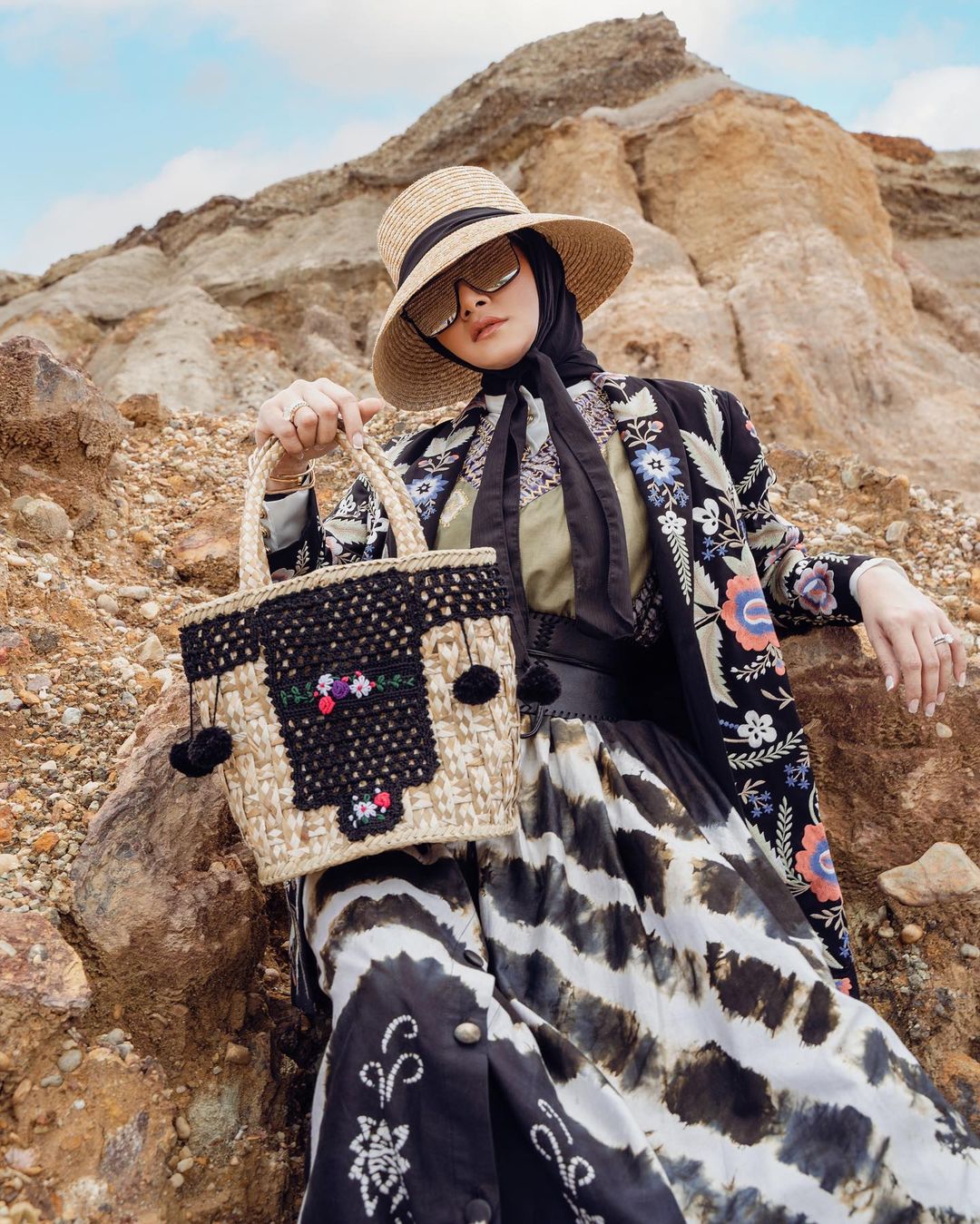 - Olla Ramlan mengenakan kain Sasirangan dengan straw hat dan kacamata. Tak lupa tas purun yang merupakan hasil kerajinan Dekranasda Creative Hub Kota Banjarbaru.