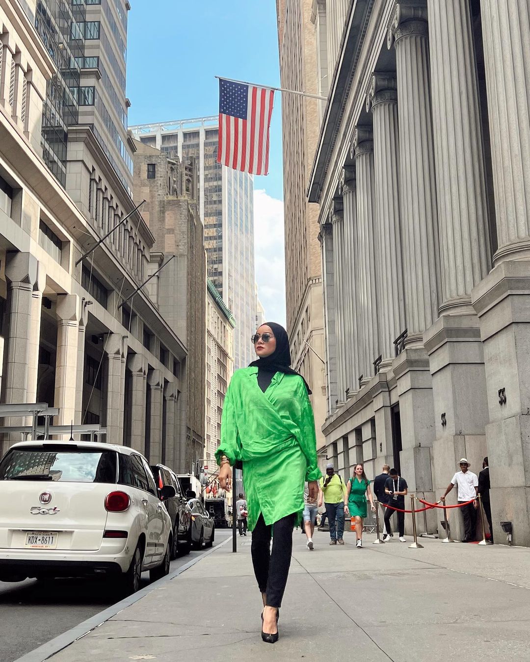 - Selanjutnya, Olla Ramlan tampil segar dengan tunik hijau neon saat berjalan di Wall Street Bull, New York. Pemilik akun instagram 19,3 juta pengikut itu memadukan dengan pashmina hitam dan celana hitam untuk menetralkan warna hijau yang cenderung terang. Agar penampilan makin paripurna, dirinya memilih sepatu cone high-heels hitam dan mengenakan kacamata hitam yang memesona.