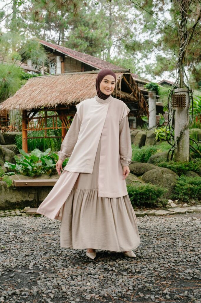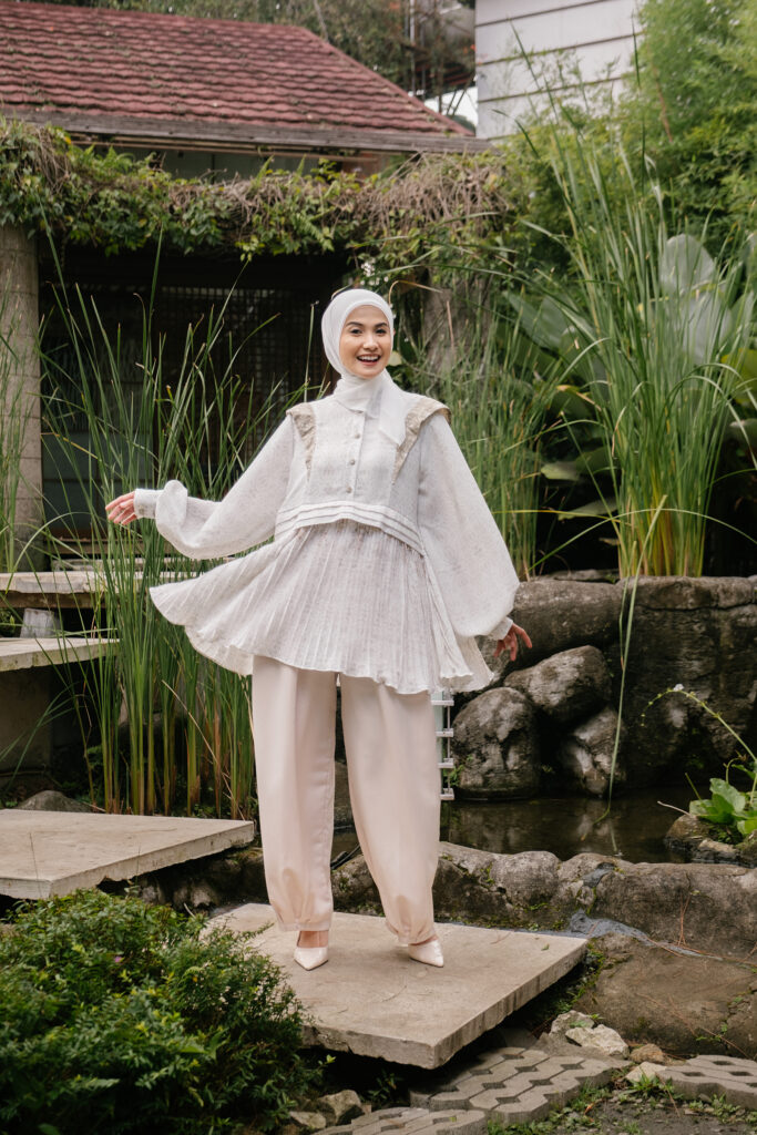 Palet warna yang penuh makna mulai dari broken white yang memberi kesan elegan dan minimalis, hijau yang melambangkan ketenangan serta kesejukan, hingga aksen oranye sebagai simbol energi dan keberanian. Kombinasi warna tersebut mencerminkan harmoni antara budaya, spiritualitas, dan gaya modern perempuan muslim masa kini.