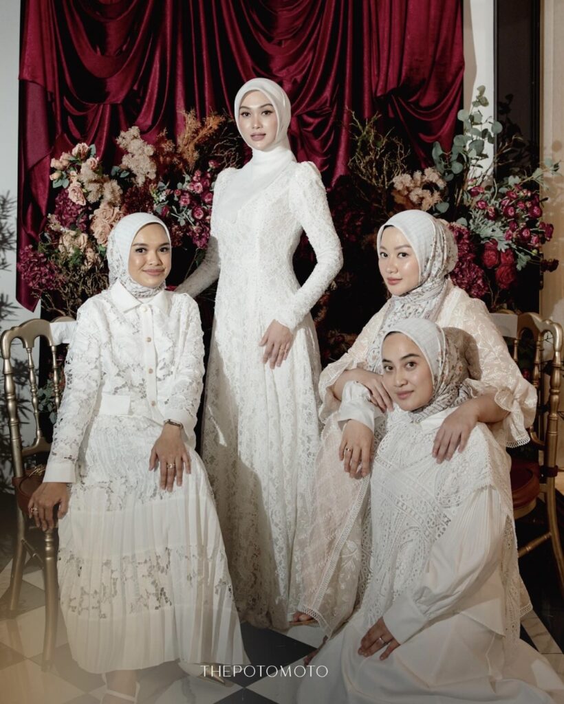 Penampilan Indah pada momen bahagianya tak luput dari perhatian. Pemilik brand Nada Puspita ini tampil anggun mengenakan kebaya putih berbahan brokat dengan potongan yang rapi dan feminin. Ia memadukannya dengan hijab bergaya clean look yang menutup dada, memberikan kesan minimalis sekaligus elegan ciri khas gaya Indah yang selama ini dikenal.