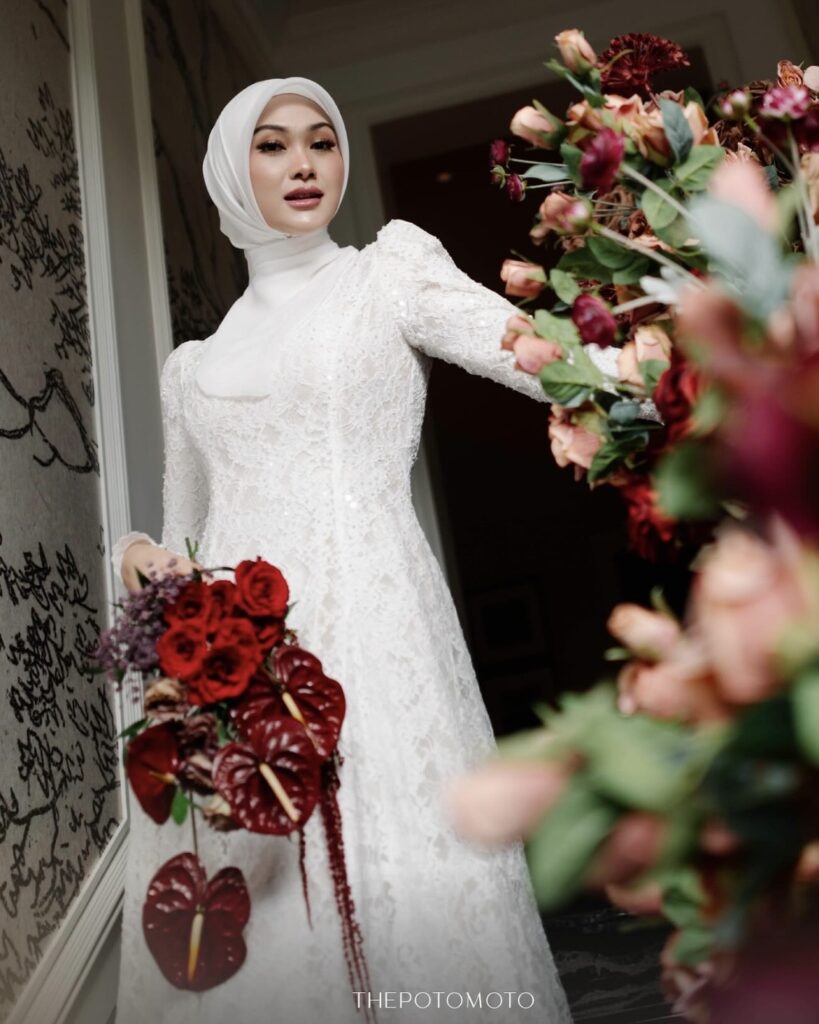 Menariknya, Indah juga merias wajahnya sendiri di hari spesial ini. Tampilan makeup yang flawless dengan sentuhan natural membuat wajahnya terlihat segar dan bercahaya. Riasan tersebut selaras dengan keseluruhan look yang menonjolkan keanggunan yang sederhana namun tetap memikat.