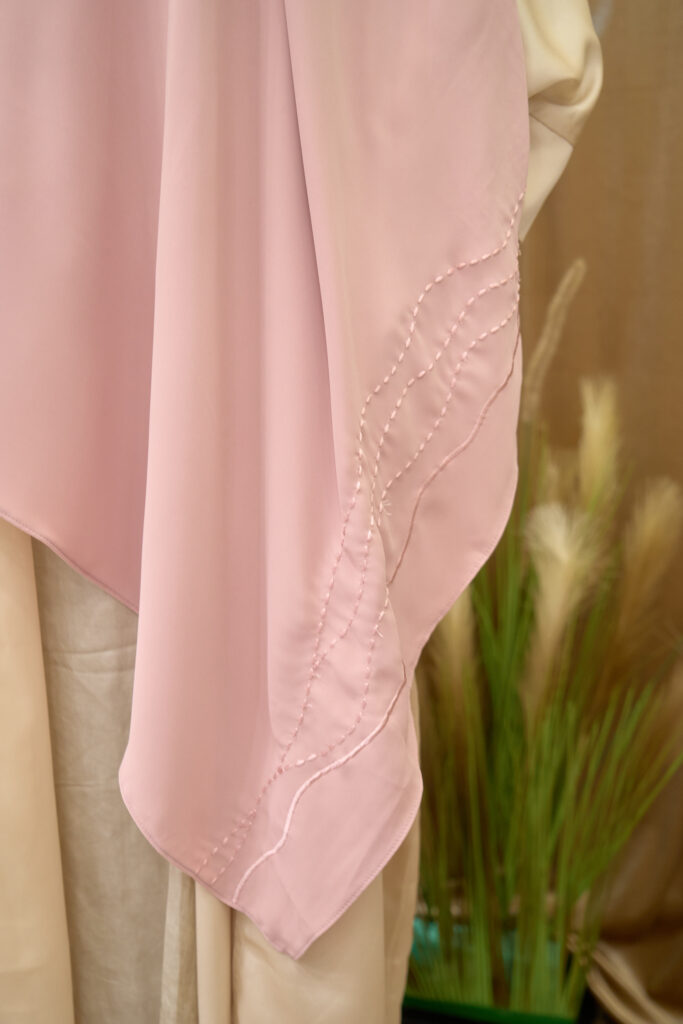 Salah satu hal yang menjadi daya tarik dari “Grace in Motion” adalah pemilihan material dan desain yang benar-benar mempertimbangkan kenyamanan. Misalnya, Rihlah Abaya yang dibuat dari bahan Tencel soft wash, memberikan sensasi adem di kulit dan tetap ringan digunakan seharian. Ada juga Amaya Outer dengan siluet kaftan yang longgar, memberikan ruang gerak lebih leluasa tanpa terasa berat saat digunakan berpindah tempat.