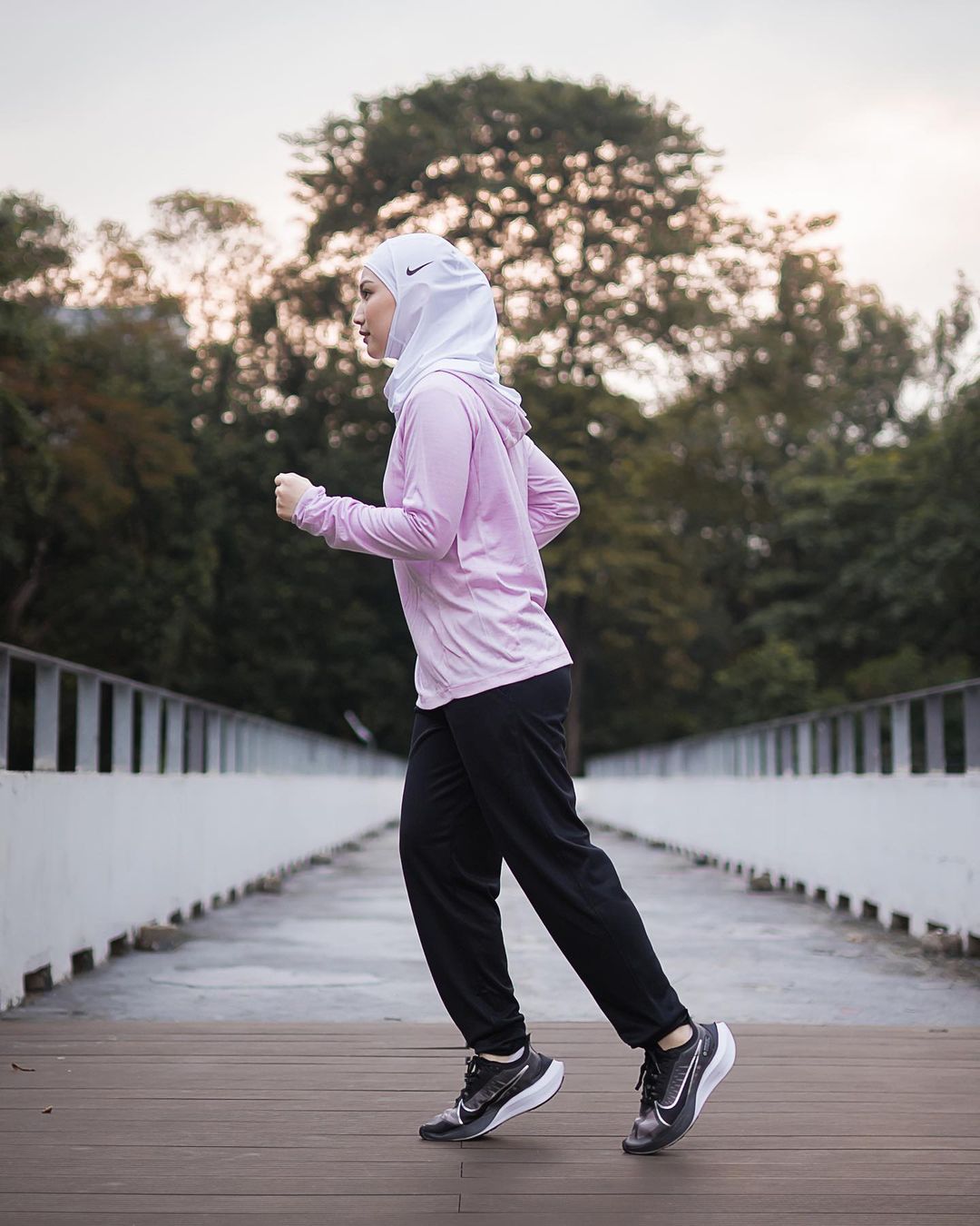 - Dengan riasan wajah yang tipis, Melody mengenakan jaket light lavender bersama celana training hitam. Sedangkan hijabnya dari Hijab Sport Nike Pro 2.0 dan sepatu running Nike Air Zoom Pegasus 38.