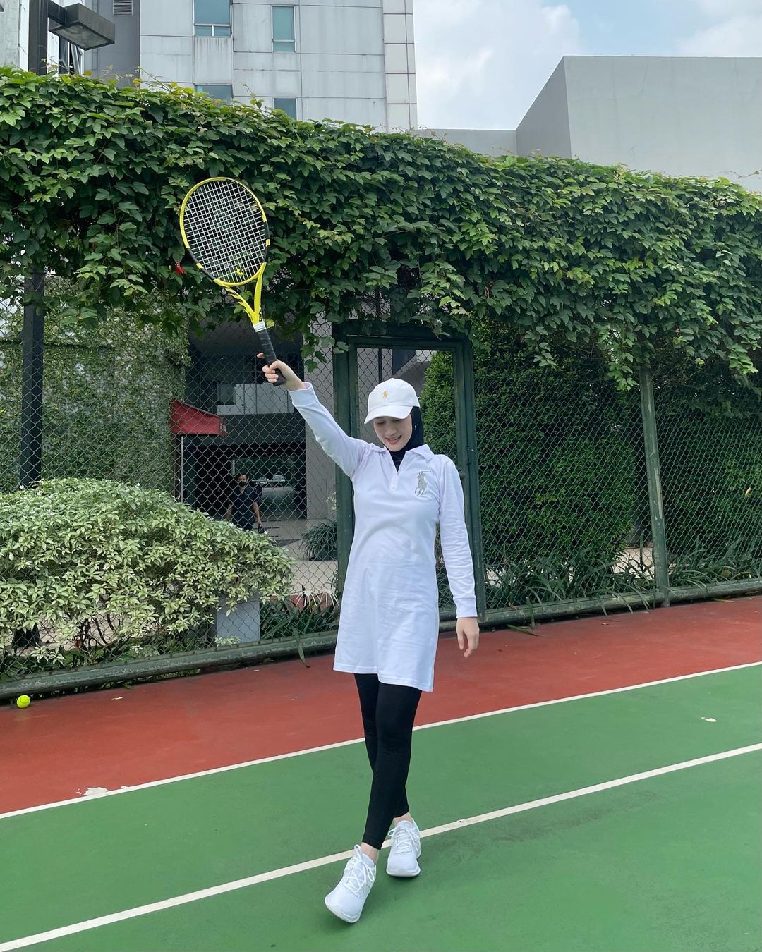 Image: melodylaksani92 (Instagram) - Melody tampil nyaman dengan baju tenis tunik lengan panjang clean white dari Ralph Lauren Corporation. Untuk menghindari terik matahari, ia memadukan topi baseball putih dan hijab sport hitam. Tak lupa celana legging hitam bersama sepatu full white bertali. Ide outfit sporty Melody bisa Scarflover jadikan inspirasi saat bermain tenis.