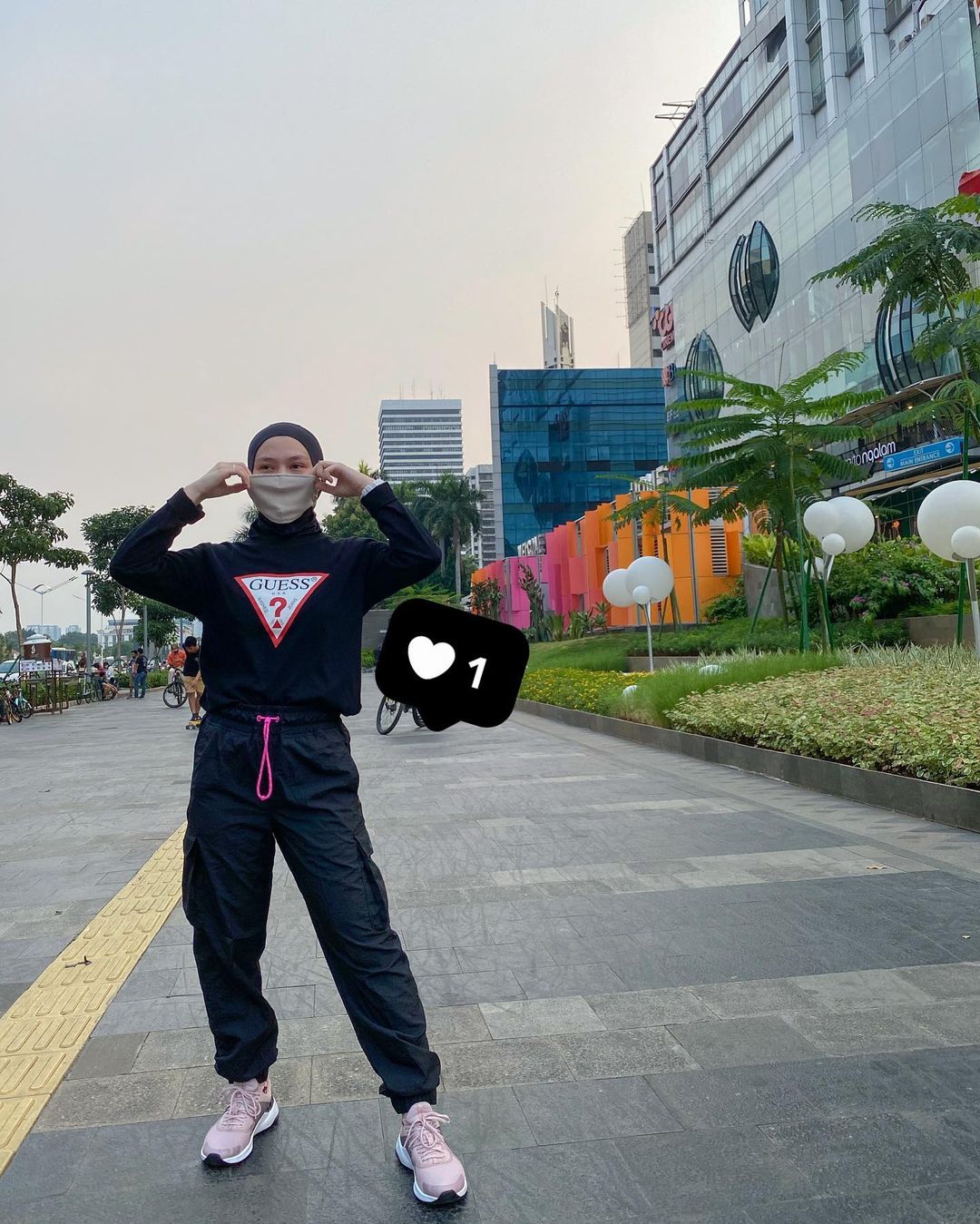 Image: melodylaksani92 (Instagram) - Saat joggging manja di sekitar Senayan Jakarta, Melody mengenakan jaket hoodie hitam Guess dengan celana training hitam bertali pink. Untuk sepatu dirinya memilih sepatu running soft pink yang mempermanis outfit sporty Melody.