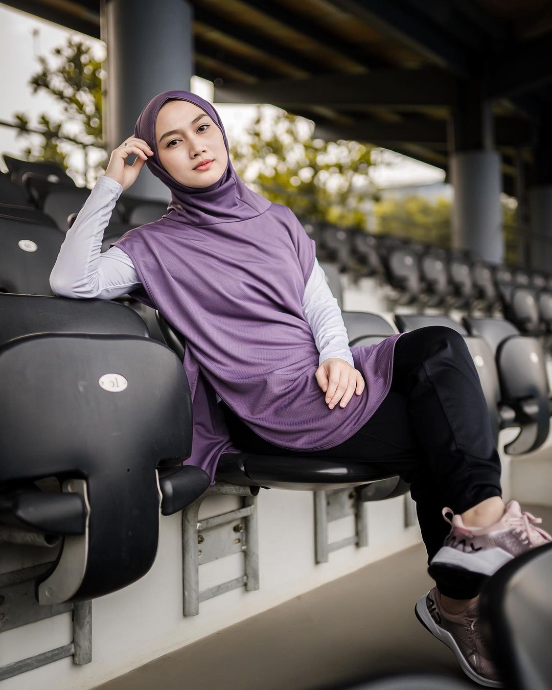 Image: melodylaksani92 (Instagram) - Semangat pagi terpancarkan dari Melody usai jogging di area Gelora Bung Karno, Jakarta. Perempuan kelahiran Bandung itu tampil modis bersama hoodie hijab short sleeve purple dan manset light grey dan celana training hitam.