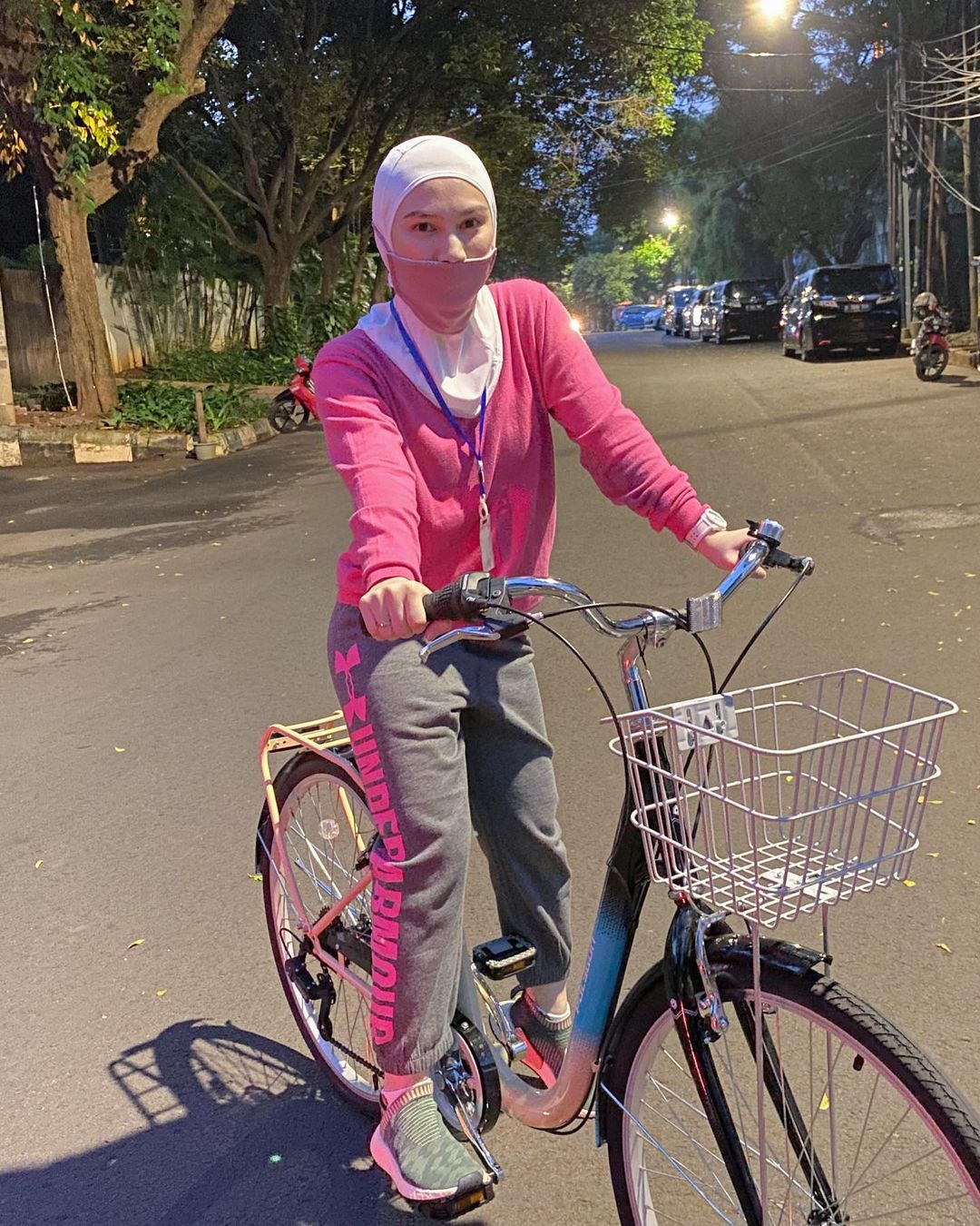 Image: melodylaksani92 (Instagram) - Outfit bersepeda keliling komplek Melody yang serba pink fuschia. Untuk menetralkan warna pink yang terang, Melody memadukan hijab sport clean white dan celana training abu-abu yang juga senada dengan sepatunya.