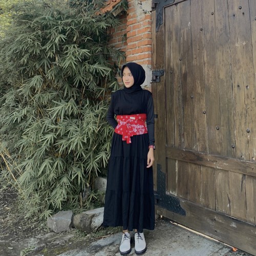 Image: Tokopedia.com Perpaduan long dress polos berwarna hitam dengan obi belt bermotif batik tradisional. Outfit dengan warna senada hitam menonjolkan obi belt yang khas. Ditambah sepatu docmart putih menampilkan kesan modis dan kekinian.