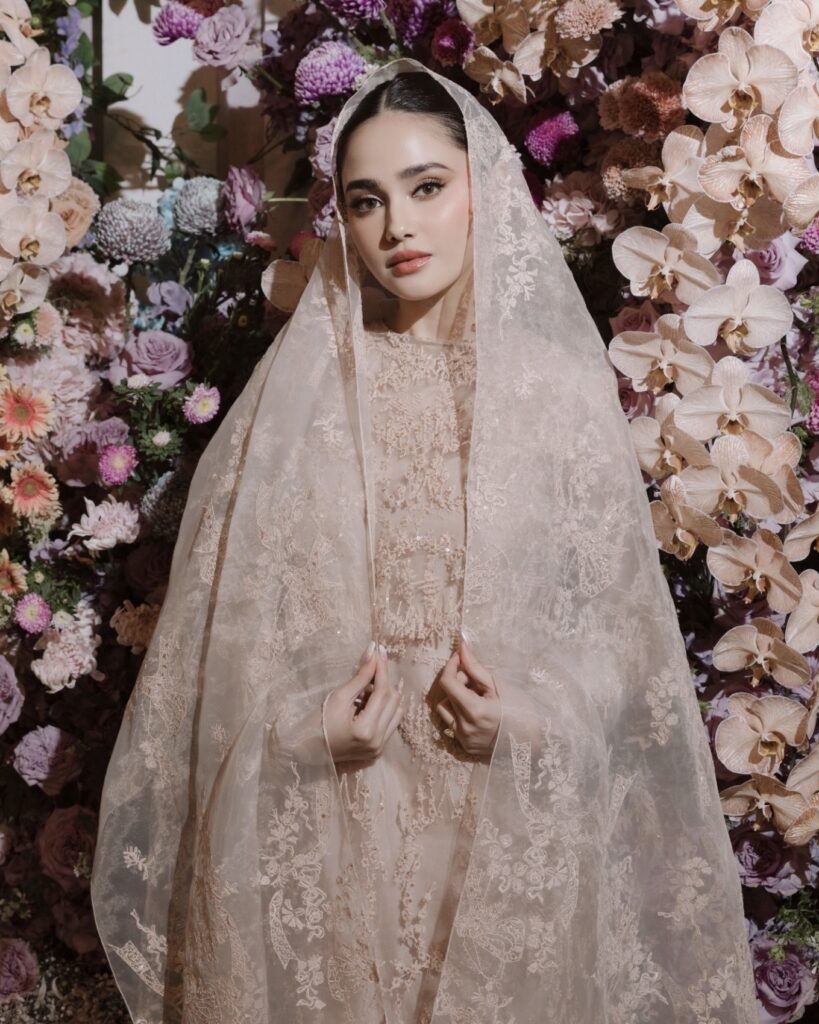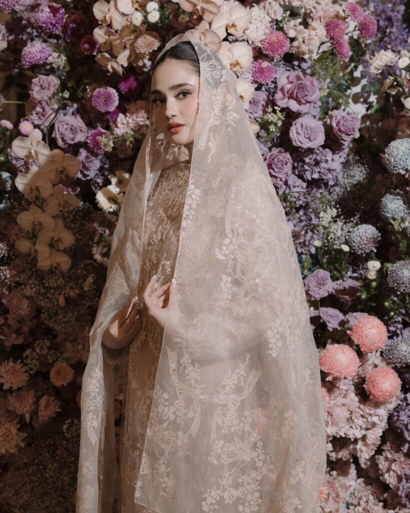Syifa tampil dalam balutan busana krem rancangan Sapto Djojokartiko. Detail bordir yang lembut berpadu dengan veil transparan menciptakan siluet yang ringan dan sakral.