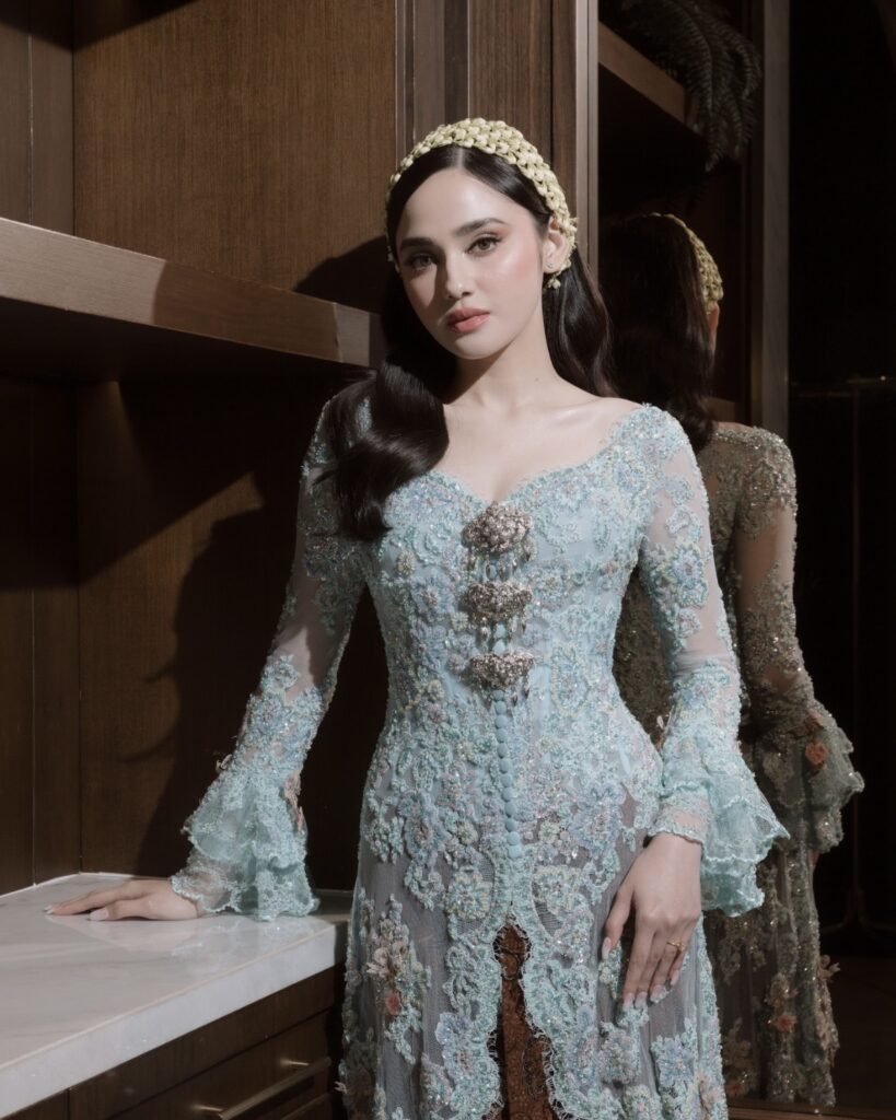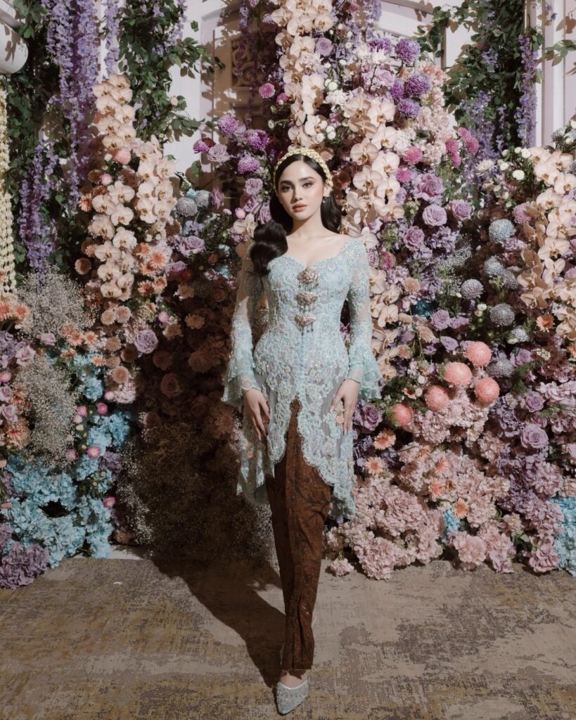 Balutan kemben biru langit dan setagen cokelat mempertegas siluet anggunnya. Rangkaian melati di pundak diperkaya aksen kristal menjadi detail yang paling mencuri perhatian.