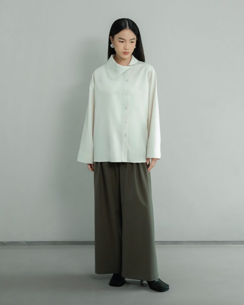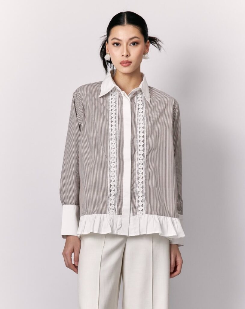 Pendekatan berbeda dihadirkan oleh Studio Tui yang mengedepankan detail feminin dalam bentuk yang halus. Blouse dengan aksen lace dan ruffle menciptakan tampilan yang lembut namun tetap terstruktur, menjadikannya pilihan yang tepat untuk suasana Lebaran yang intimate sekaligus mudah diadaptasi untuk aktivitas harian. Dipadukan dengan tailored pants, tampilannya menjadi polished untuk ruang kerja, sementara kombinasi dengan denim menghadirkan nuansa yang lebih santai tanpa kehilangan karakter elegannya.
