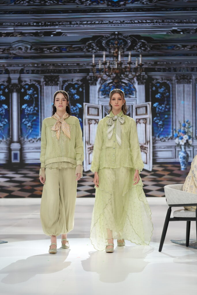 Pendekatan ini kemudian diterjemahkan lebih jauh melalui pilihan material yang berakar pada alam. Penggunaan tulle dan organza sutra alami menjadi elemen penting dalam membangun karakter busana yang ringan dan breathable. Kedua material ini menghadirkan kemewahan yang lembut—bukan kilau yang mencolok, melainkan tekstur halus yang terasa nyaman dikenakan sepanjang hari, selaras dengan filosofi keberlanjutan dan keanggunan alami.