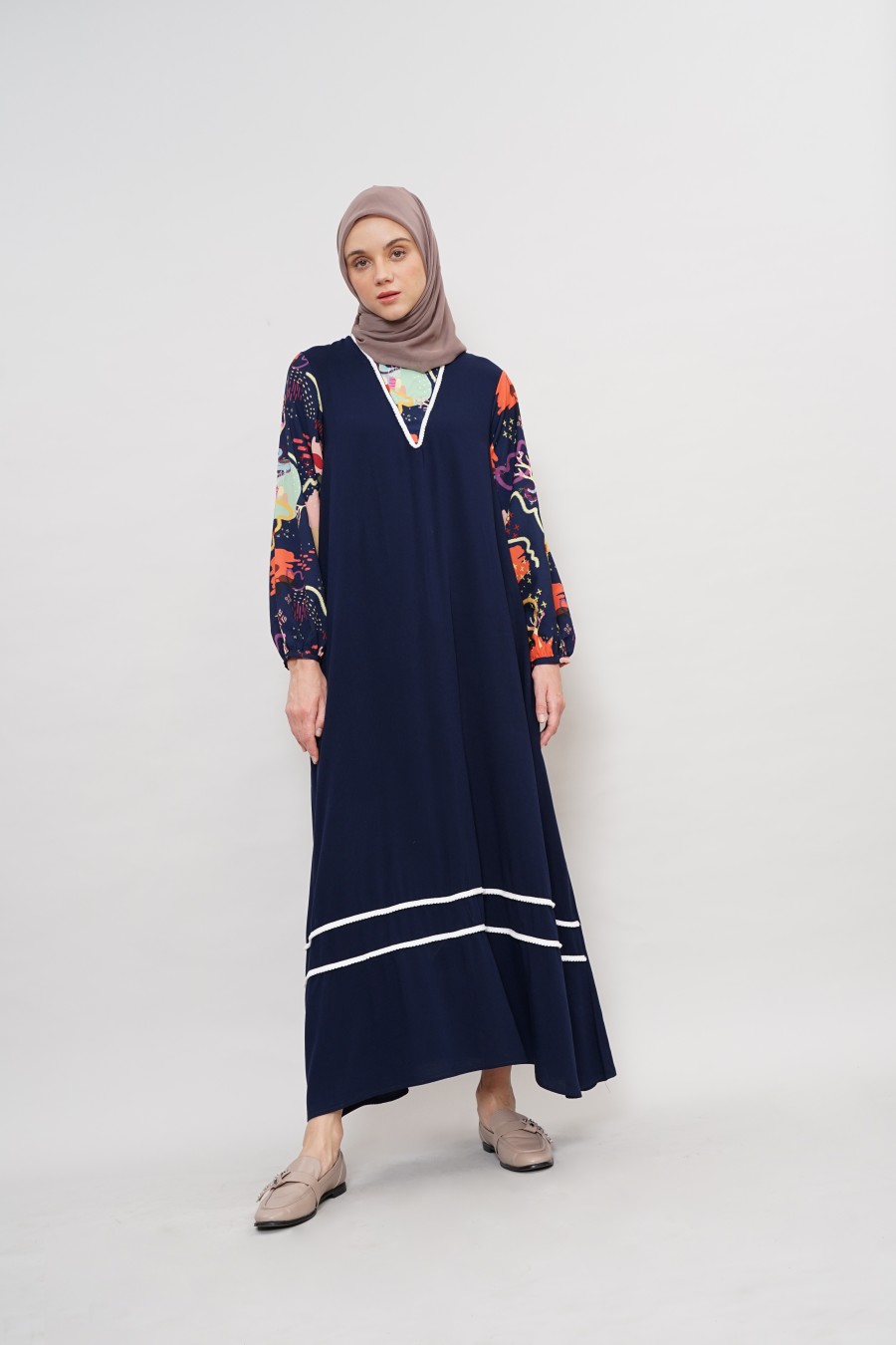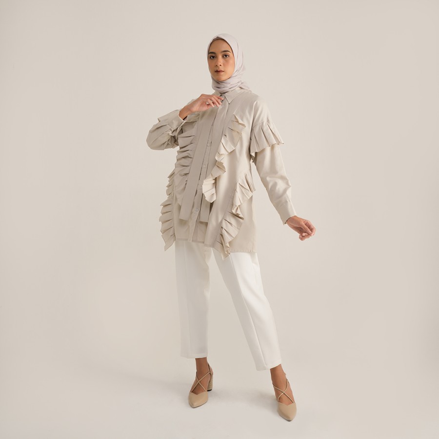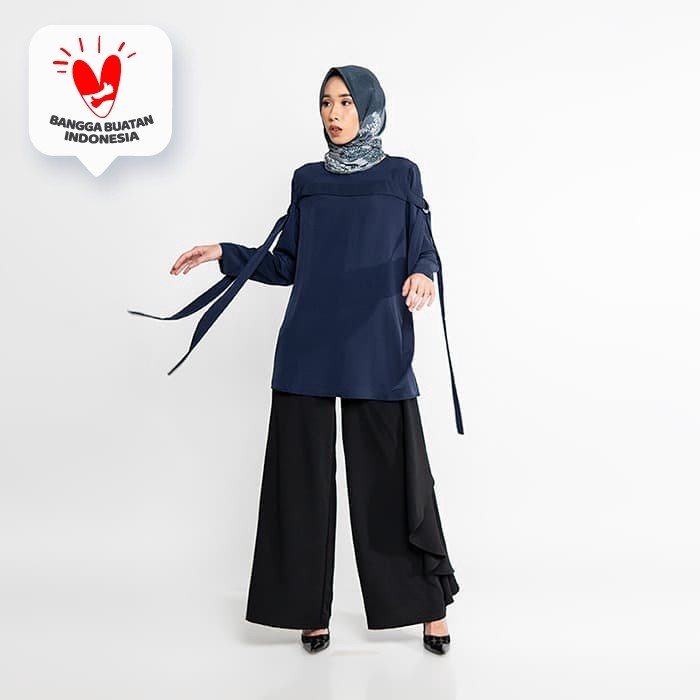Blouse berwarna Navy dari Jenahara ini mencuri perhatian banget. Dengan detail di sekitar lengan atas dan sentuhan ring silver di bagian lengannya bikin blouse yang sebenarnya simpel ini tetep kelihatan unik. Blouse ini bisa banget dipakai untuk acara non formal sehari-hari. Kamu tinggal padupadankan blouse ini dengan kulot dan hijab motif berwarna senada.