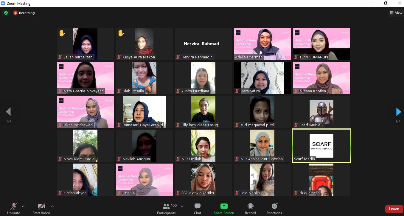 Dalam menyambut Hari Ibu, pada Minggu (19/12) Scarf Media yang bekerjasama dengan Scarlett Whitening mengadakan webinar National Women Gathering dengan tema “Reveal Your Beauty”. Acara ini dipandu dengan Adelia Loekman dan tiga pembicara yaitu, Rikha Indriaswari sebagai presenter dan content creator, Linda Kayhz sebagai content creator, dan Nidaan Khofiya sebagai marketing campaign officer Scarlett Whitening.
