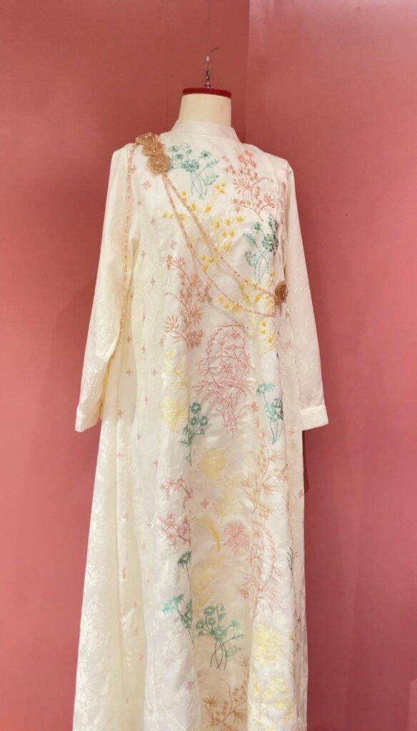 Pada lini Ria Miranda signature, warna soft pink kembali menjadi sorotan utama. Nuansa feminin ini diperkaya dengan sentuhan detail full beads yang diaplikasikan secara menyeluruh, menghadirkan kemewahan yang elegan namun tetap terasa refined. Detail tersebut memperlihatkan eksplorasi craftsmanship yang matang, sekaligus memperkuat kesan istimewa pada busana Raya.
