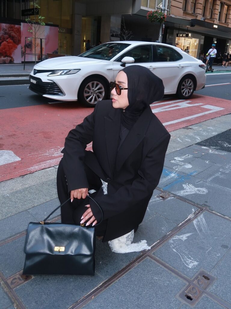 Influencer lulusan Universitas Muhammadiyah Malang tampil beda dengan outfit serba hitam. Aghnia memadukan blazer hitam bersama vest leather. Scarf Lover bisa mencuri ide rok batik untuk penampilan yang makin paripurna.