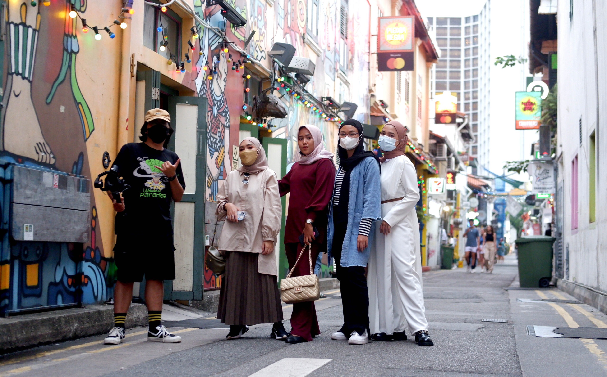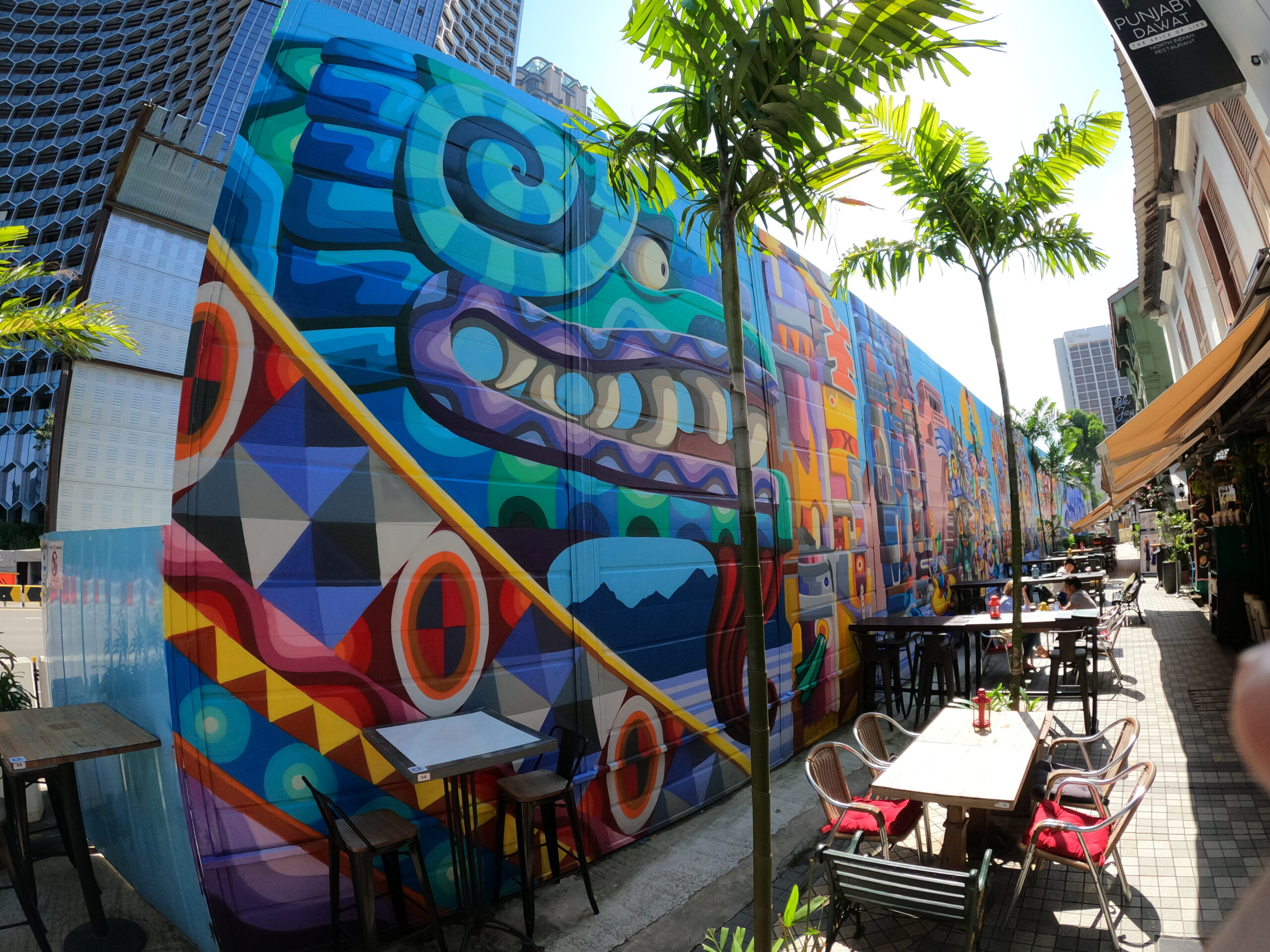 Berjalan-jalan di sekitar Kampong Gelam memang tidak pernah membosankan. Selain banyak café dan butik menarik, tapi juga deretan mural seni yang menghiasi fasad café dan butik dengan warna warna cerah. Mural mural tersebut karya local artis Singpura dan juga internasional seperti Didier Jaba Mathieu, Sheryo x The Yok, Oak, Binda dan lainnya.