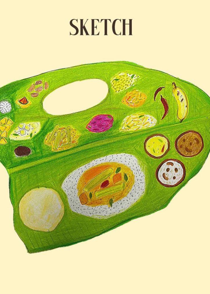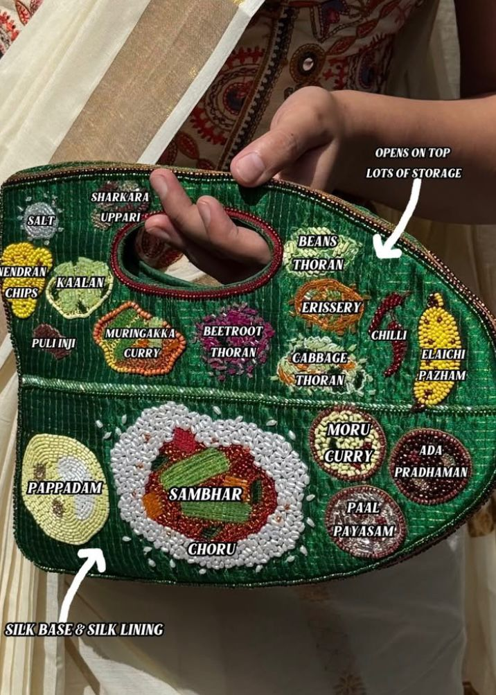 The Sadhya Bag bukan hanya sebuah tas, tapi juga “perjamuan” dalam bentuk aksesori. Terbuat dari kain sutra, dilapisi material premium, lalu dihiasi sulaman tangan yang menggambarkan menu khas Sadhya. Ada pappadam renyah, sambhar yang kaya rempah, erissery dari labu kuning, hingga paal payasam yang manis semuanya diwujudkan dengan benang sutra dan manik kaca.