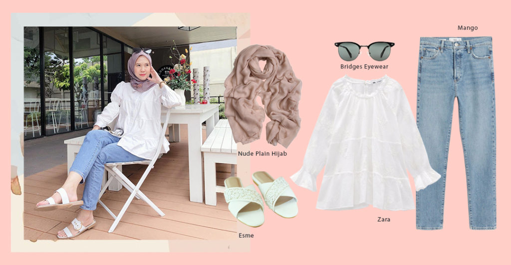 Pemilihan blouse putih polos dan jeans bisa dipadukan dengan hijab warna apapun selama masih netral agar tampilan tidak terlalu mencolok. Salah satunya dengan warna dusty pink ini. Anda bebas memilih brand apapun selama Anda merasa nyaman. (AA)