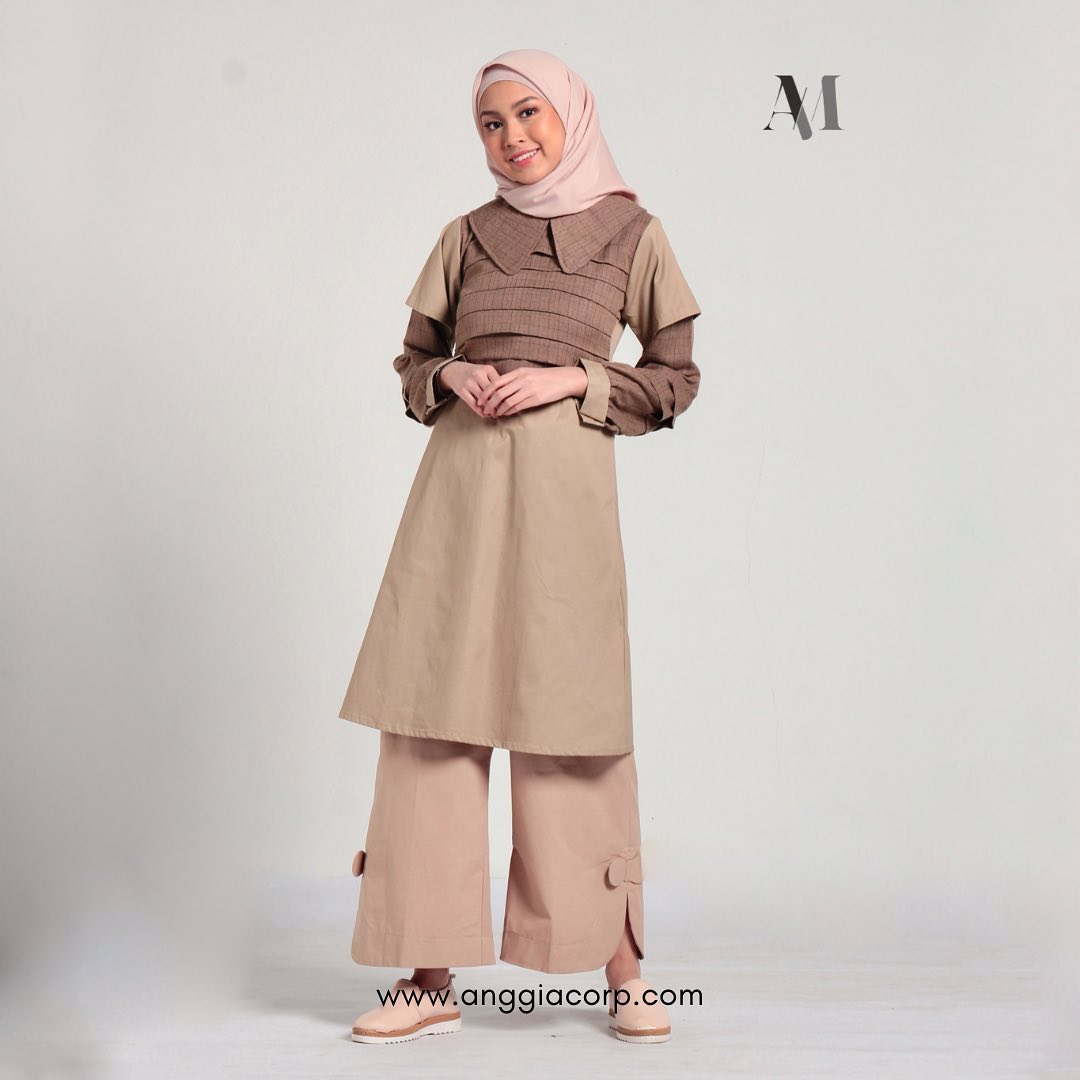 2. Tunik mocca ini bisa Anda padukan dengan sepatu warna krem dan peach. Dengan detail pita dan potongan lengkungan pada area betis membuat outfit Anda tampak manis. Koleksi Am by Ambiya Anggia Sari bisa Anda dapatkan melalui https://anggiacorp.com/ atau e-commerce kesayangan Anda, Tokopedia “Anggia Handmade”.