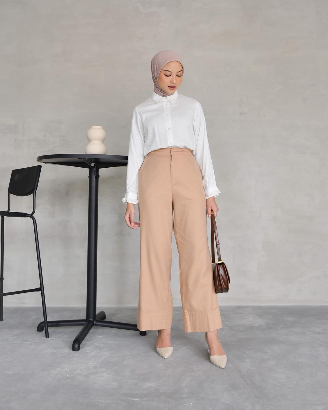 3. Perpaduan warna pastel yang lembut ini membuat Anda terlihat kalem. Mulai dari warna hijab light latte, kemeja putih, kulot charme cocok dipakai saat melakukan rapat internal perusahaan. Tak lupa pula tas selempang kulit berwarna coklat gelap. Agar mempercantik outfit pilihan high heels light beige ya Scarf Lovers. Outfit di bawah ini adalah koleksi dari Pulchra Gallery yang bisa Anda pesan lewat https://pulchragallery.com/.